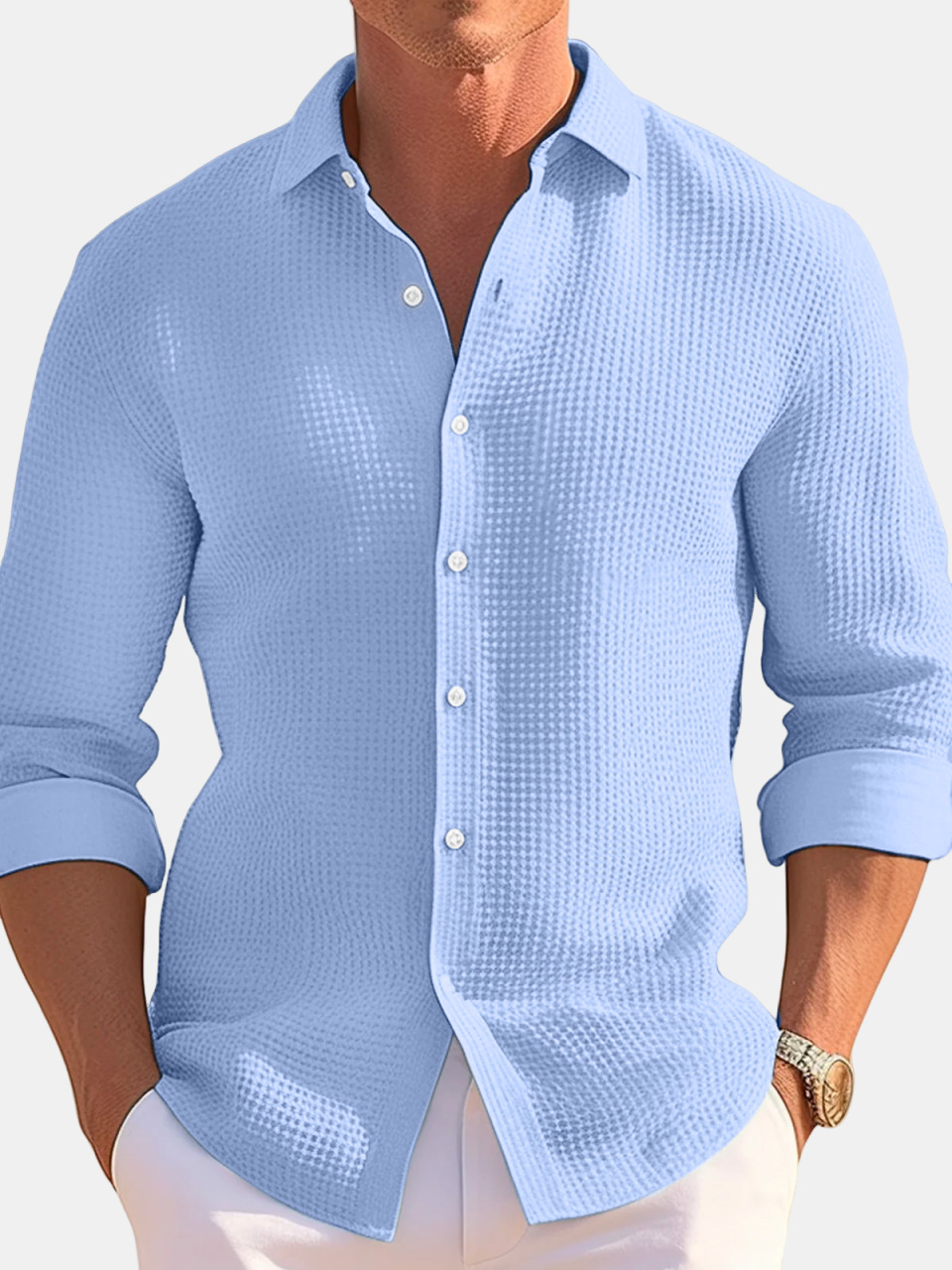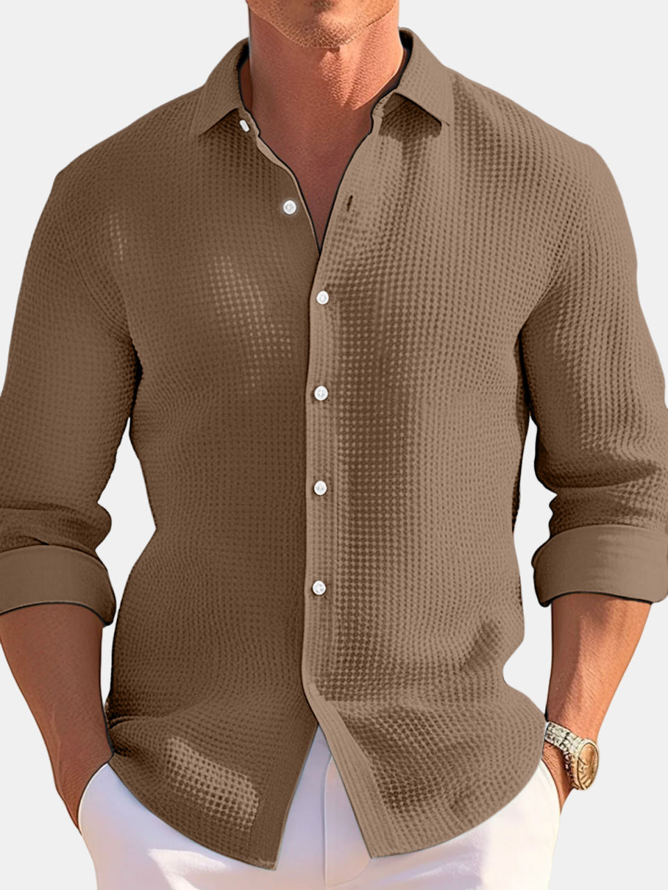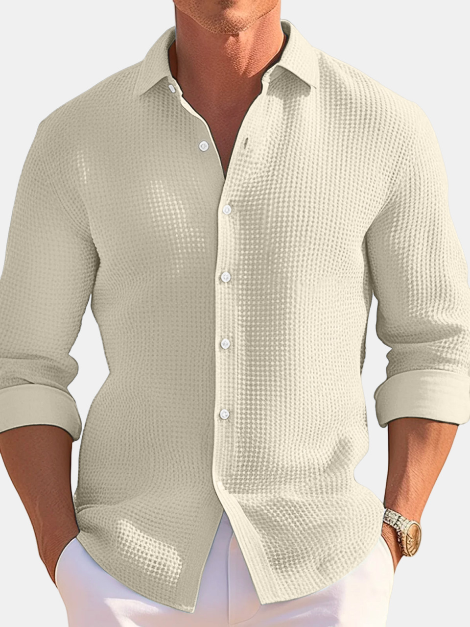 Men's Casual Loose Solid Color Waffle Long Sleeve Shirt