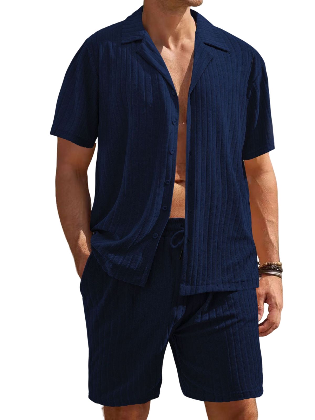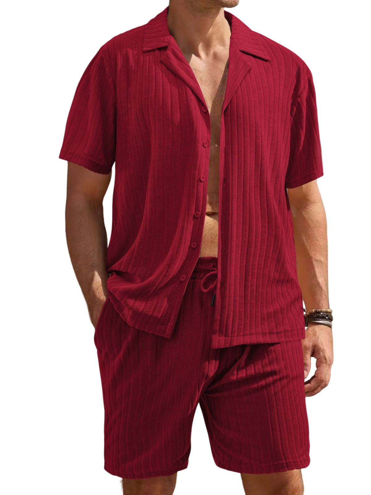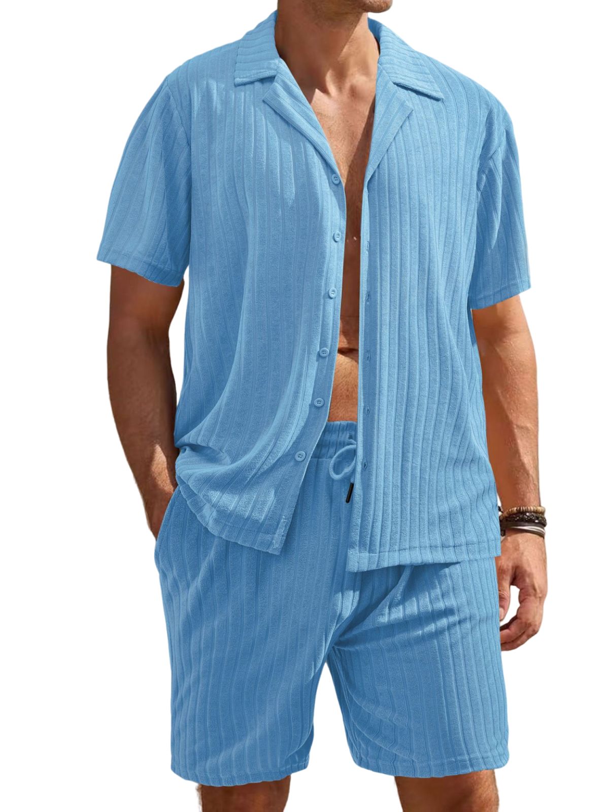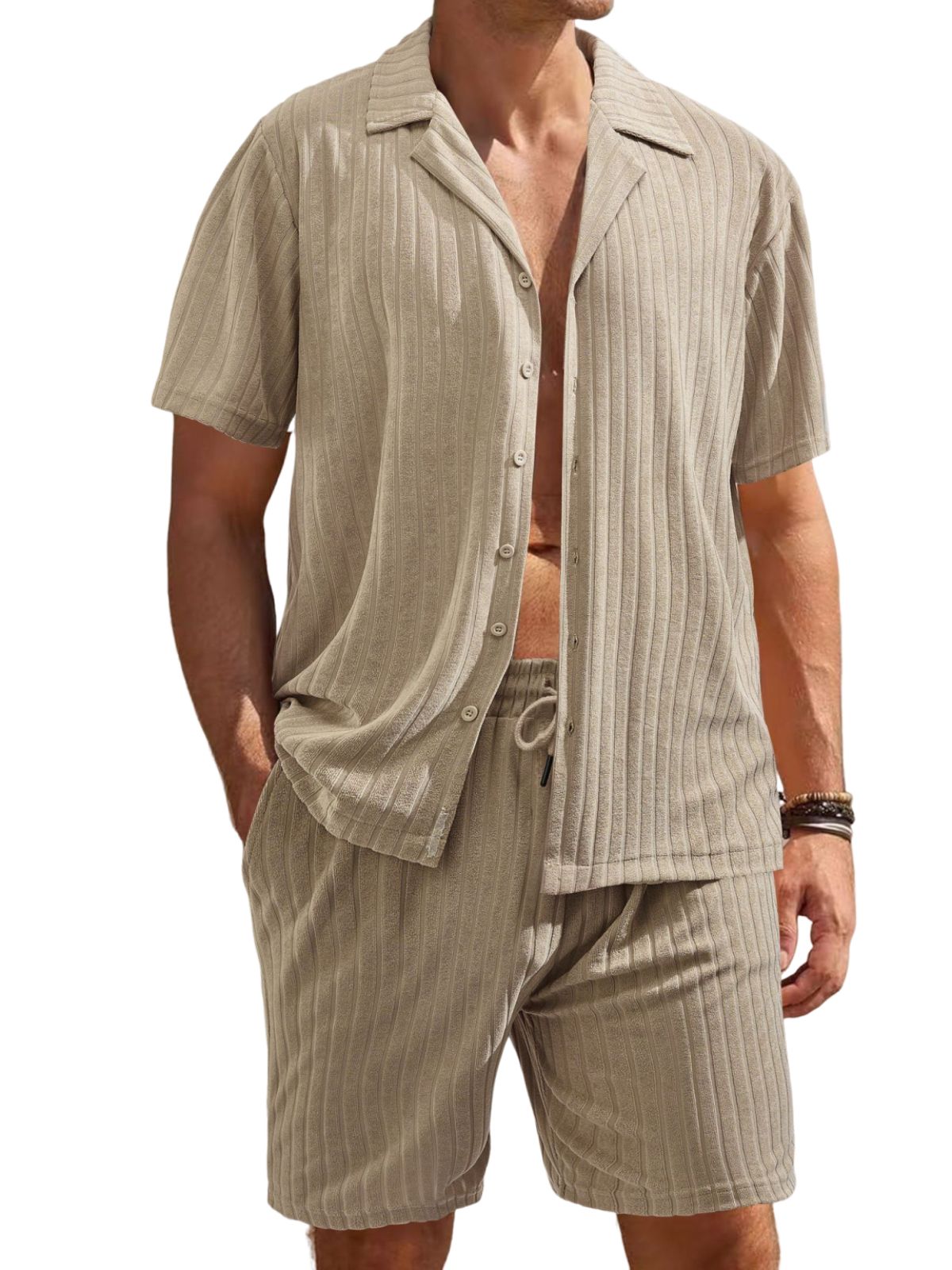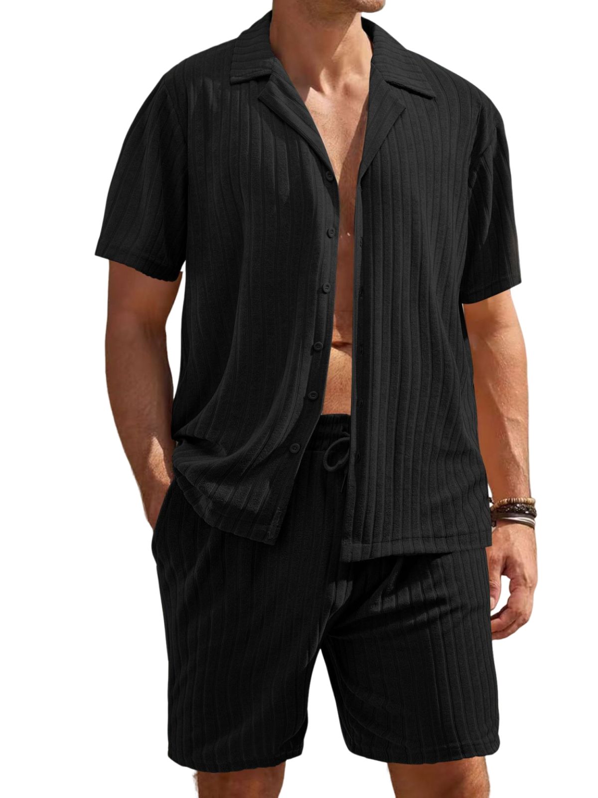 Men's Comfortable Towel Jacquard Casual Cardigan Short Sleeve Shorts Set