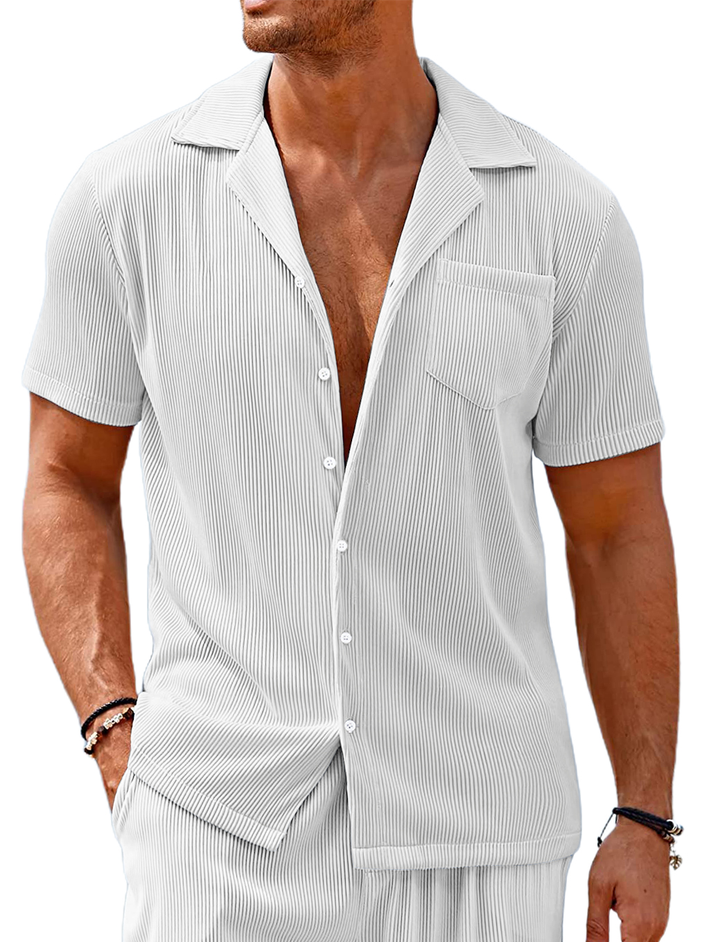 Men's Cuban Collar Pocket Solid Color Vertical Striped Pocket Short-sleeved Shirt