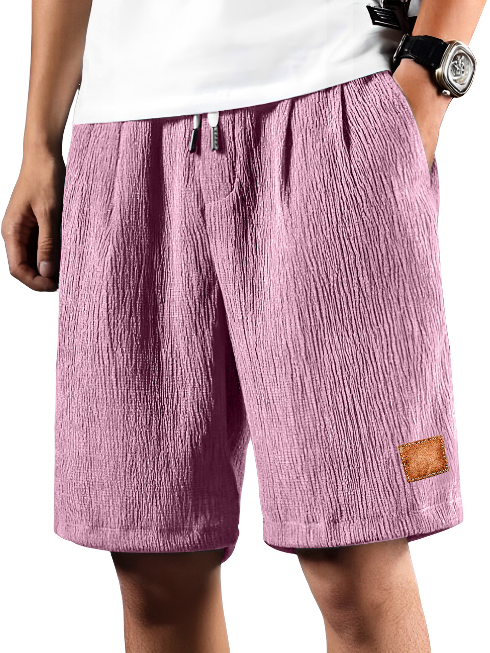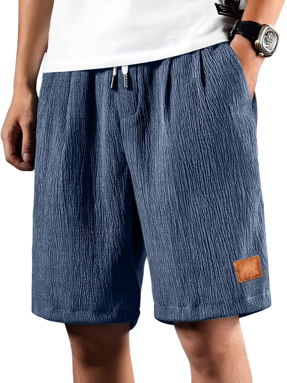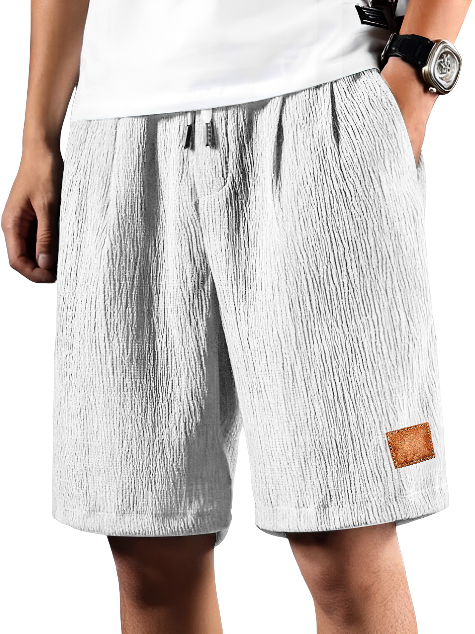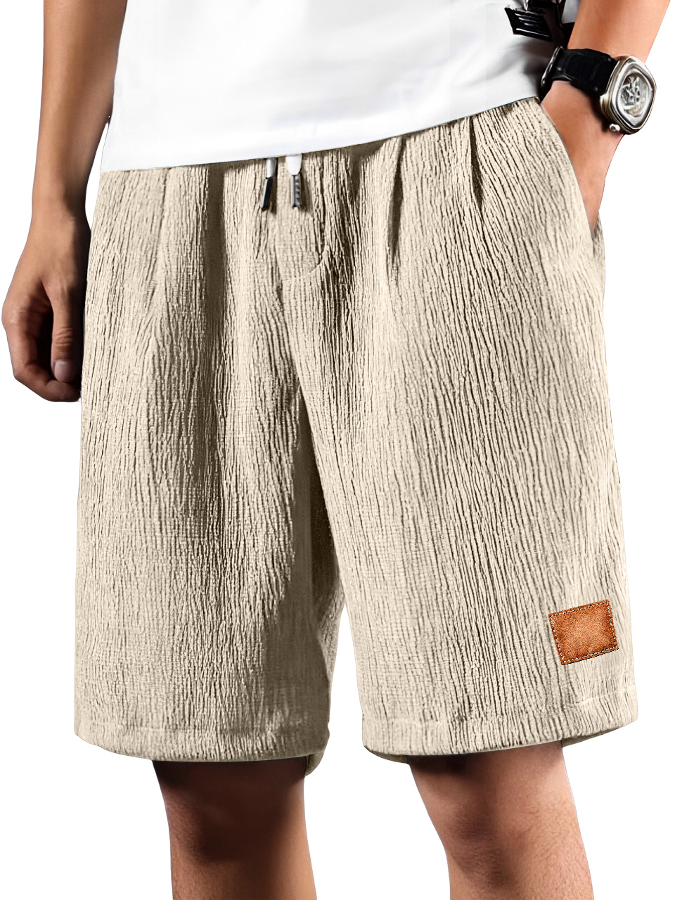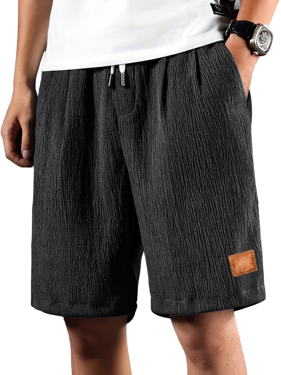 • Men's Daily Pleated Texture Embroidered Logo Drawstring Casual Shorts