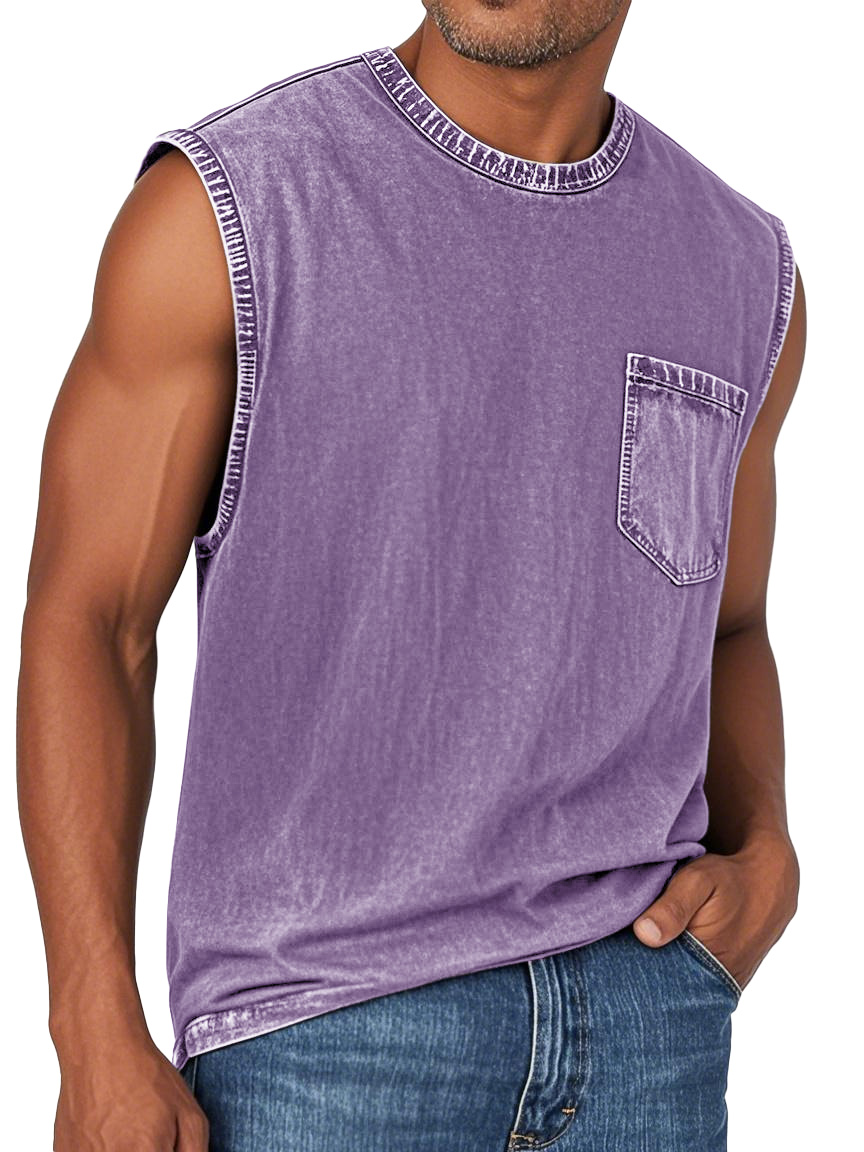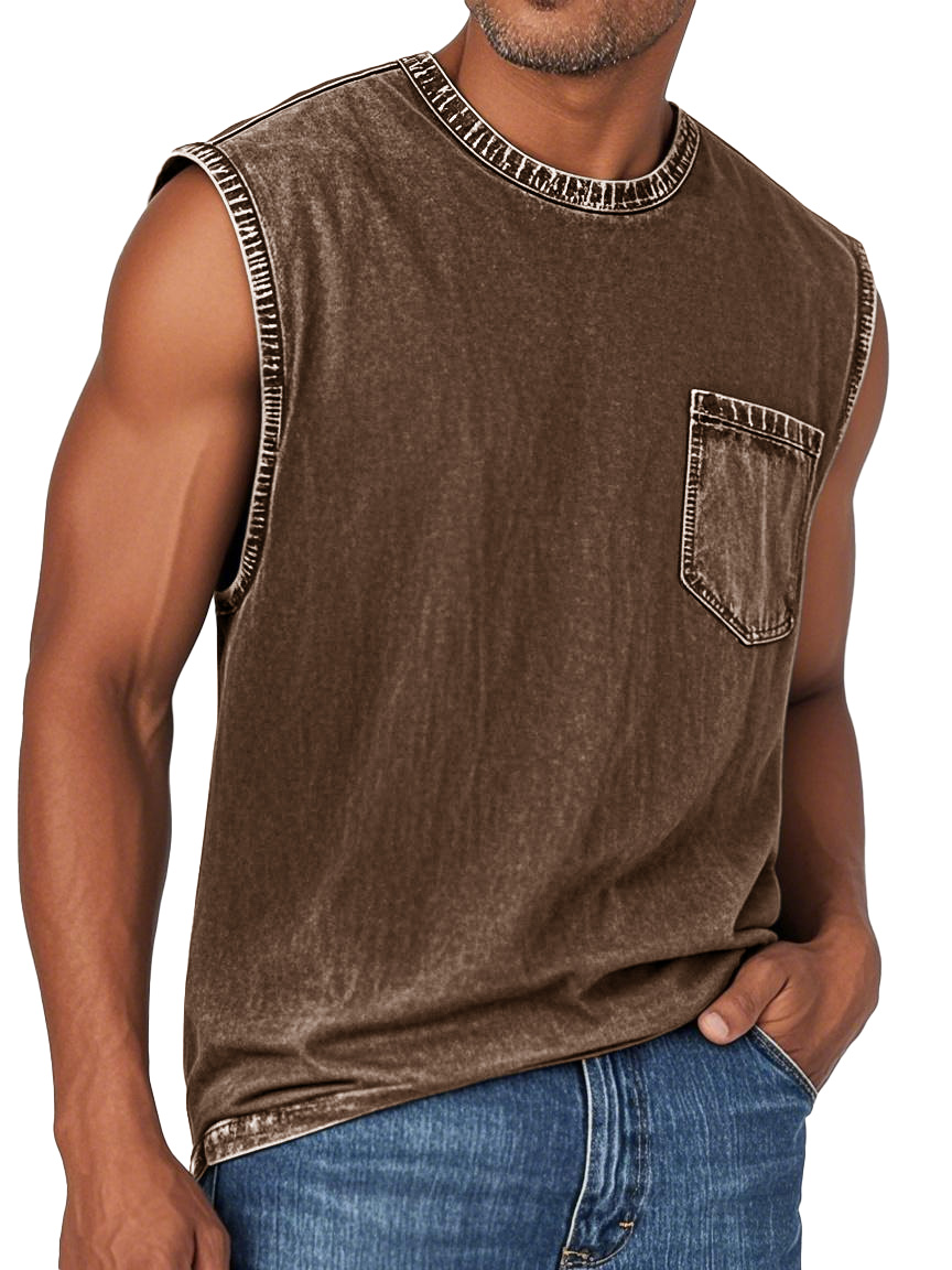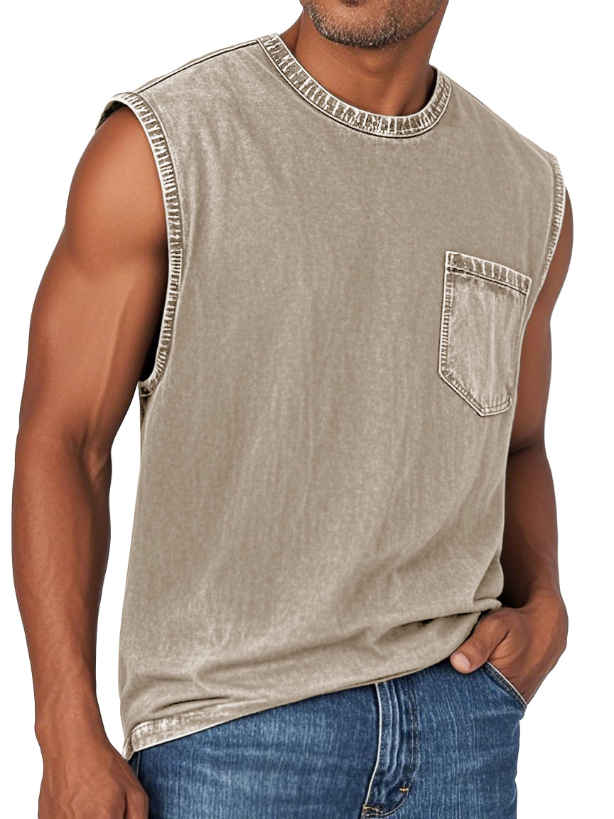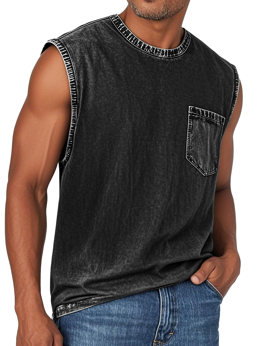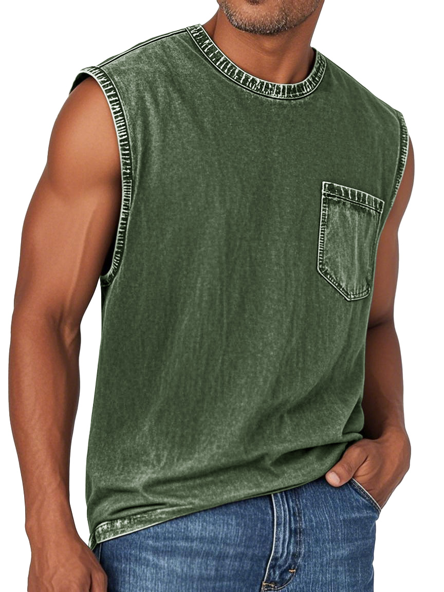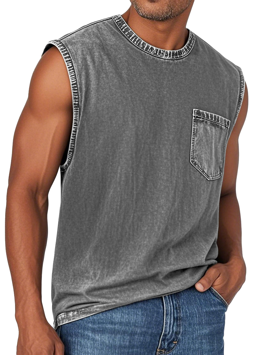 • Men's Fashion Retro Washed Round Neck Pocket Sleeveless T-shirt