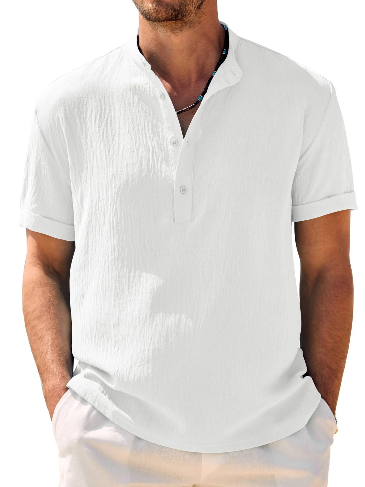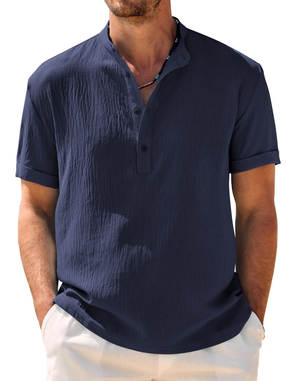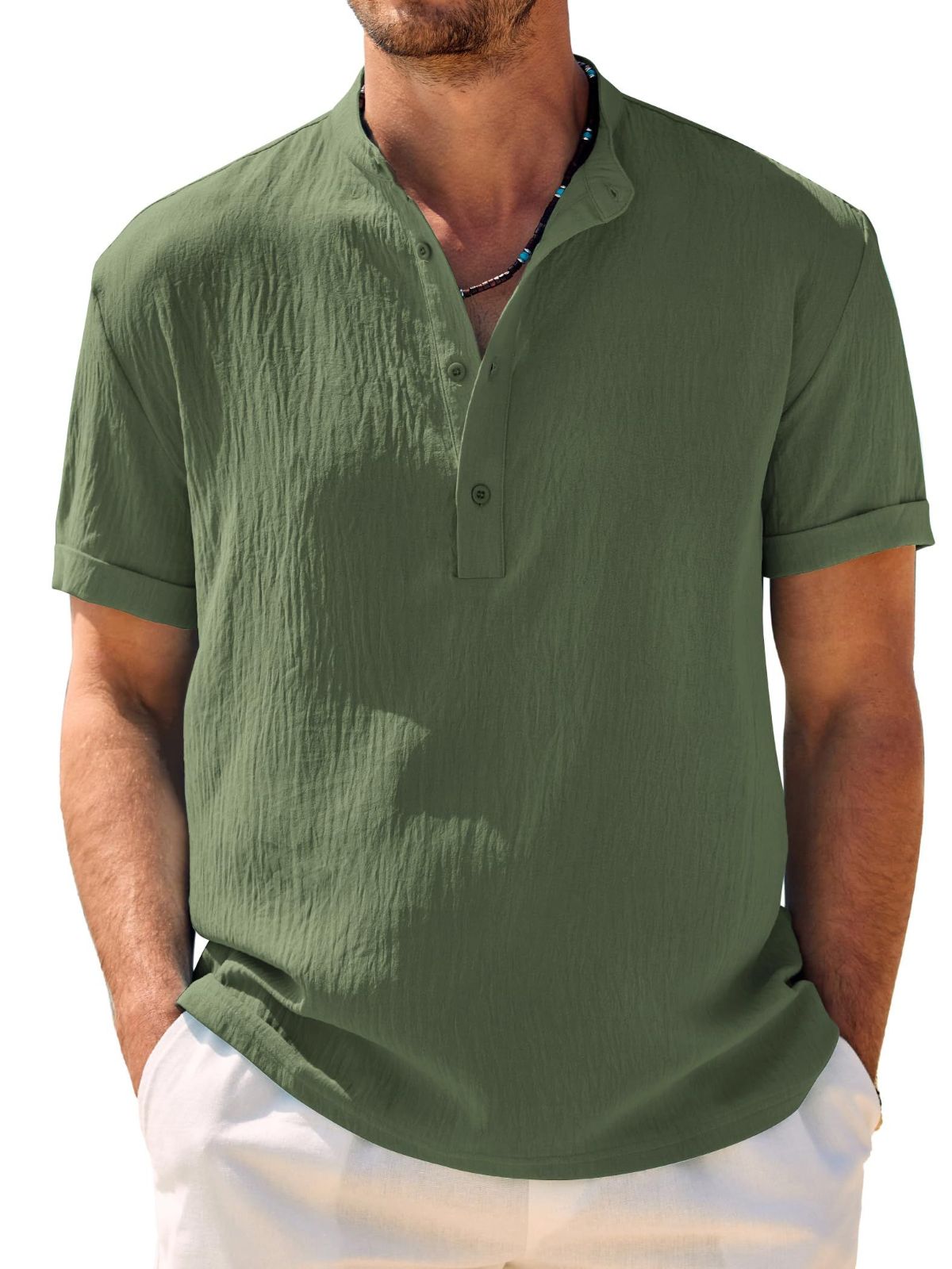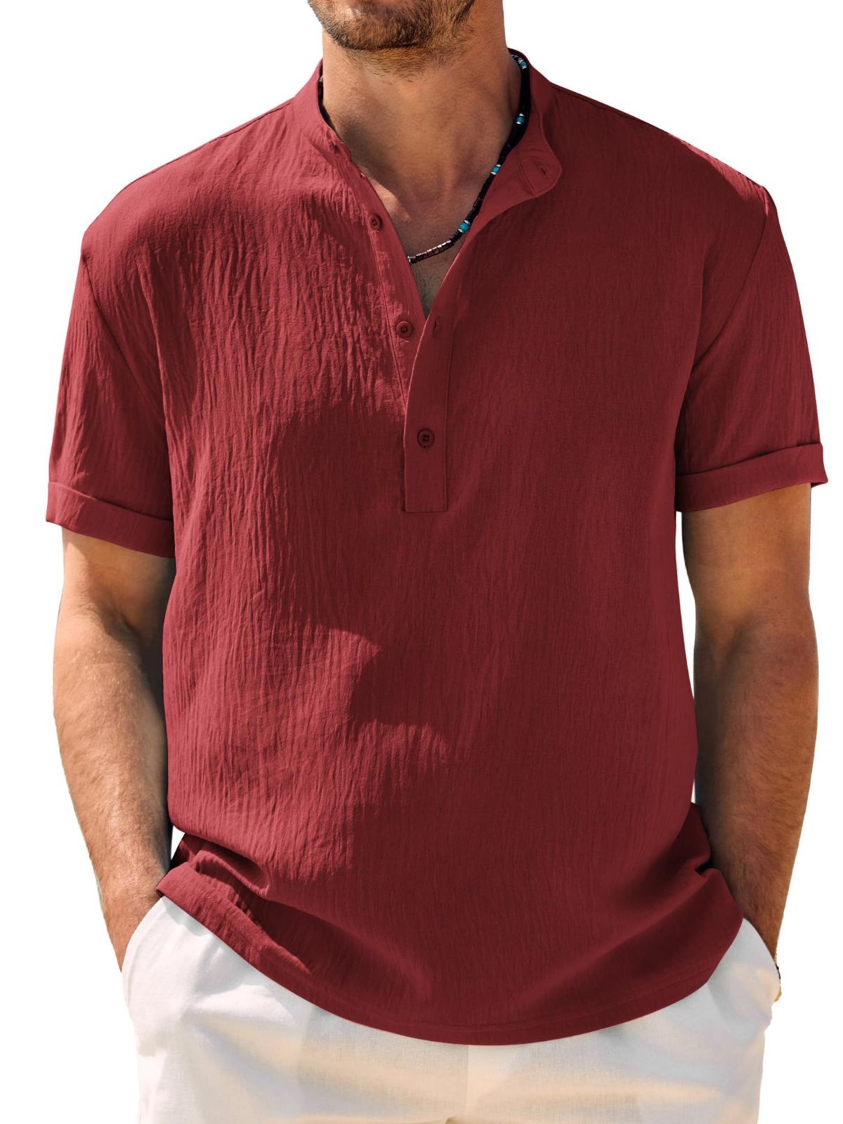Men's Linen Pleated Loose Comfort Henley Button-Down Casual Short Sleeve Shirt