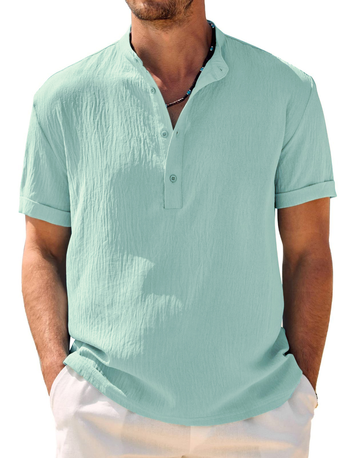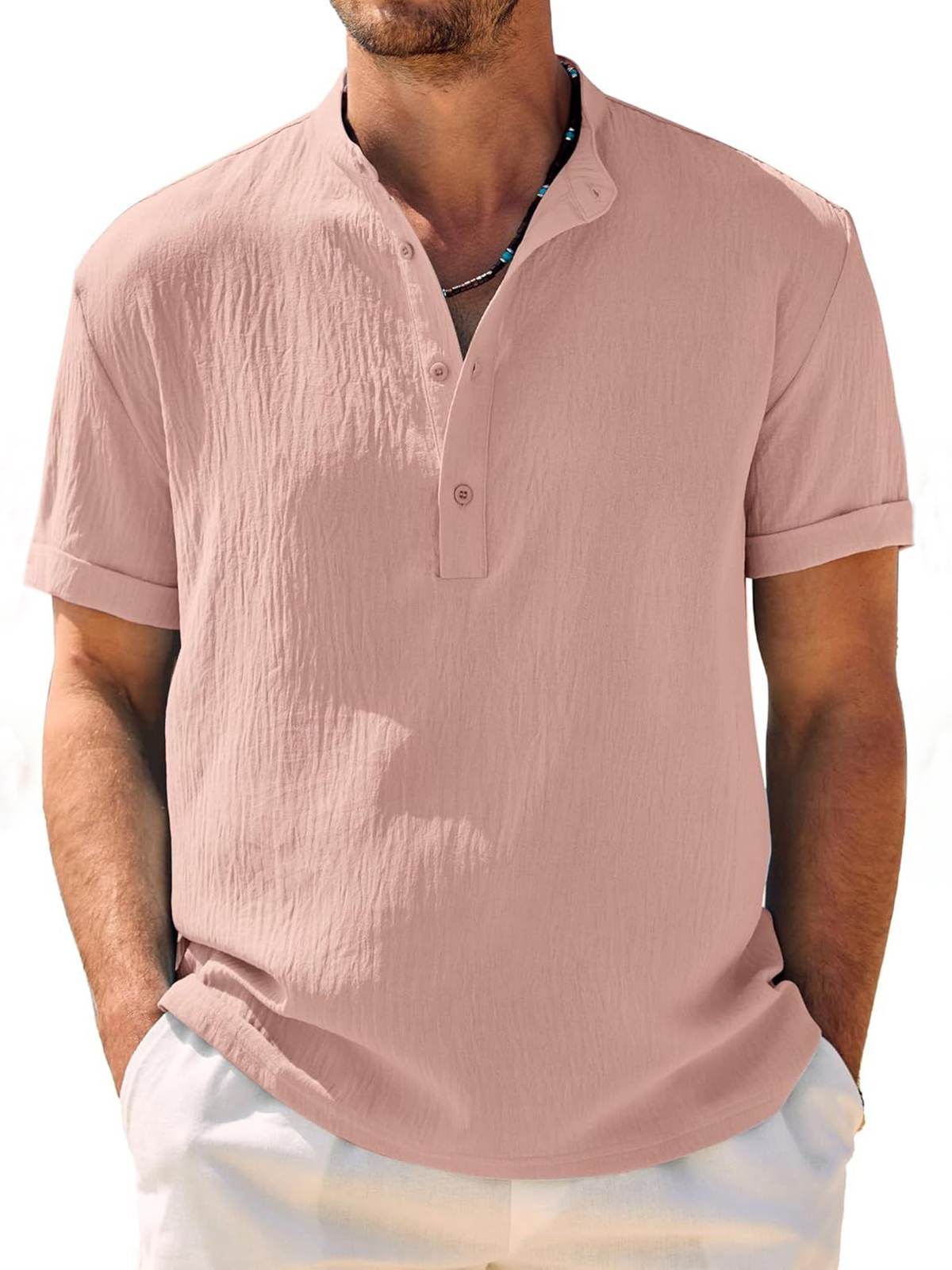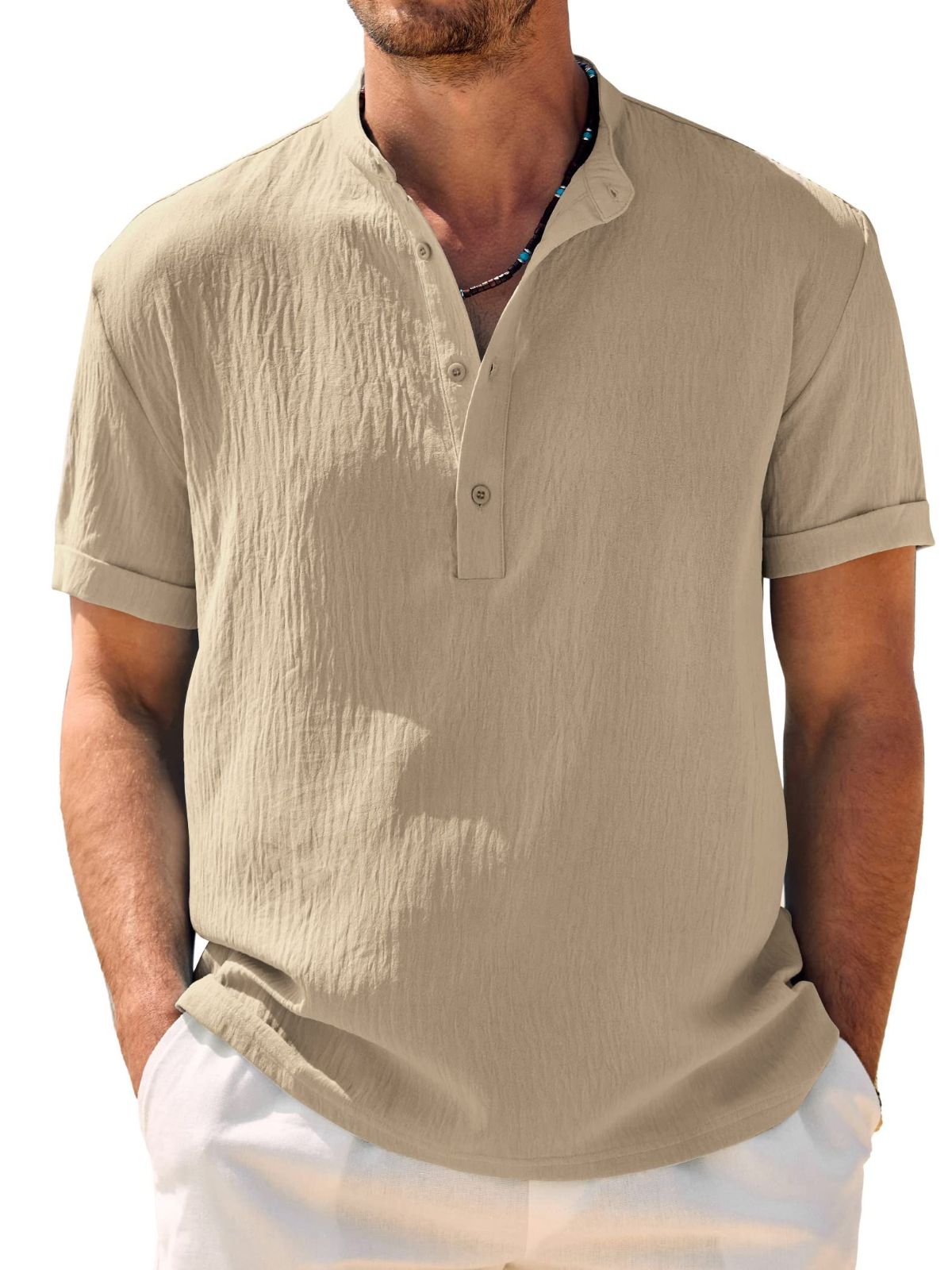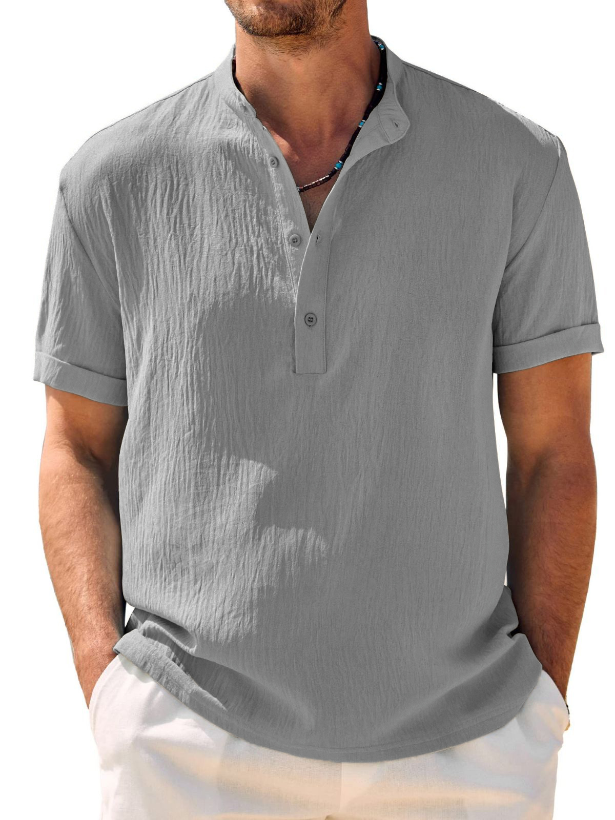 Men's Linen Pleated Loose Comfort Henley Button-Down Casual Short Sleeve Shirt