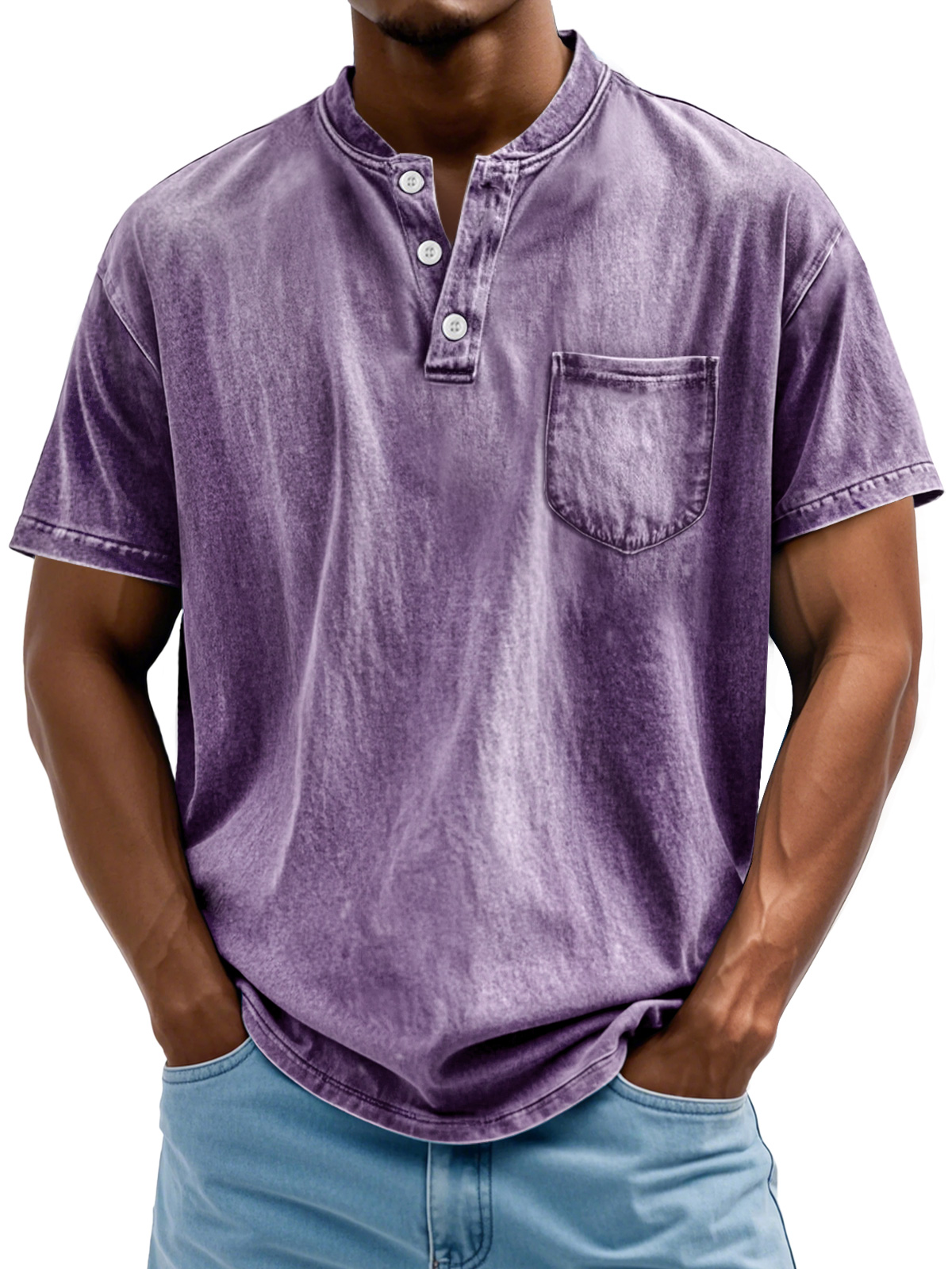 Men's Retro Stand Collar Pocket Casual Solid Color Short Sleeve Henley Shirt