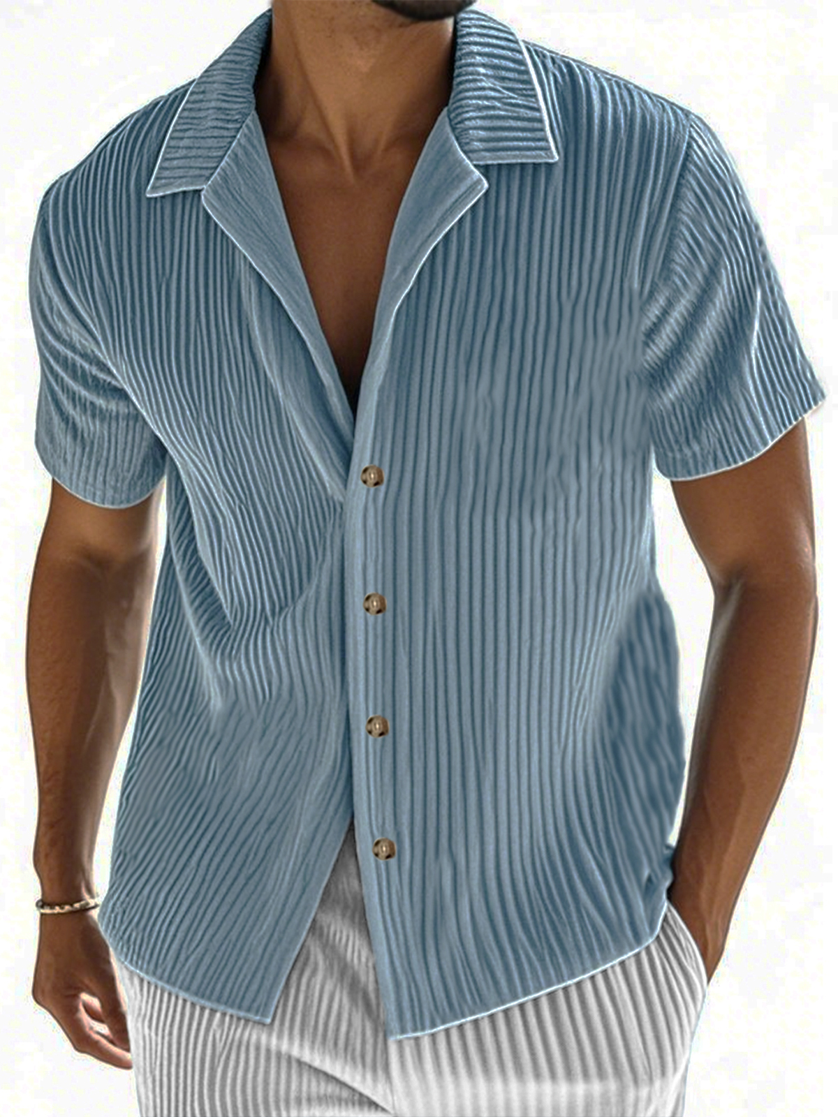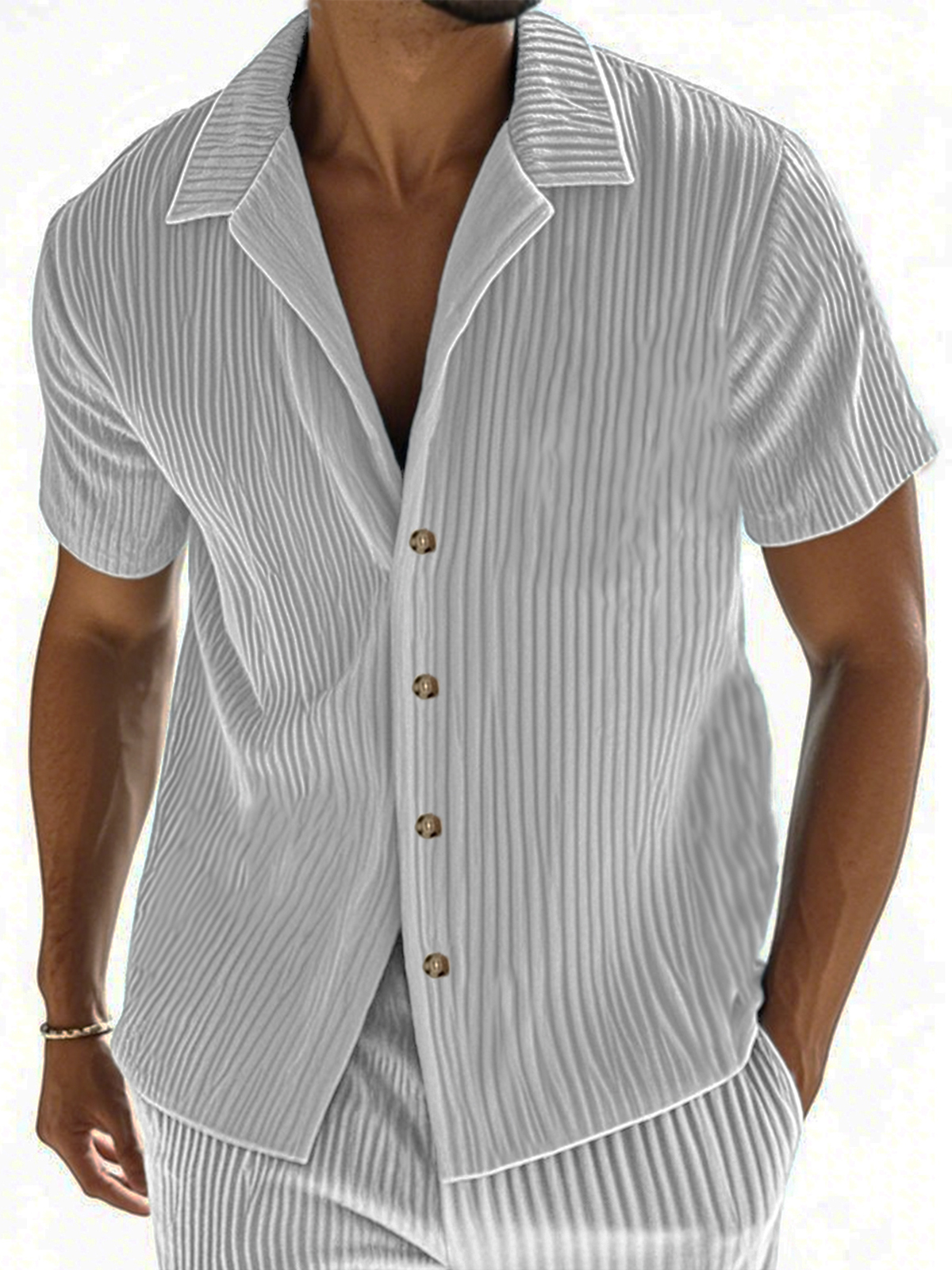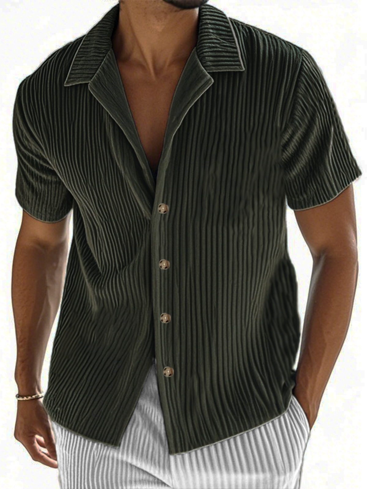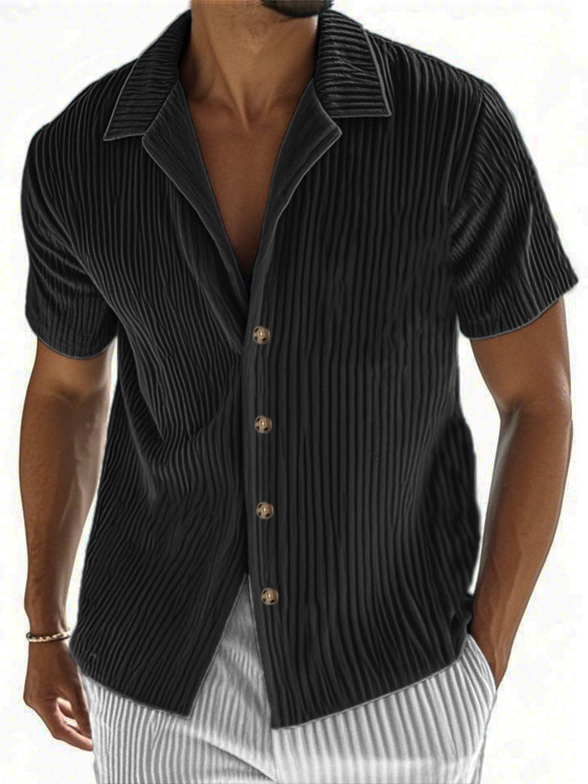 • Men's Ribbed Vertical Striped Camp Collar Short-sleeved Lapel Shirt