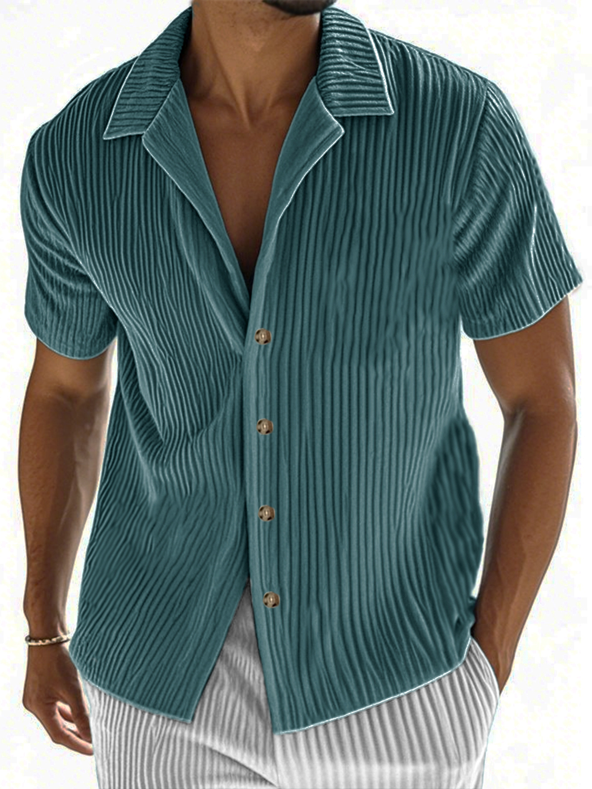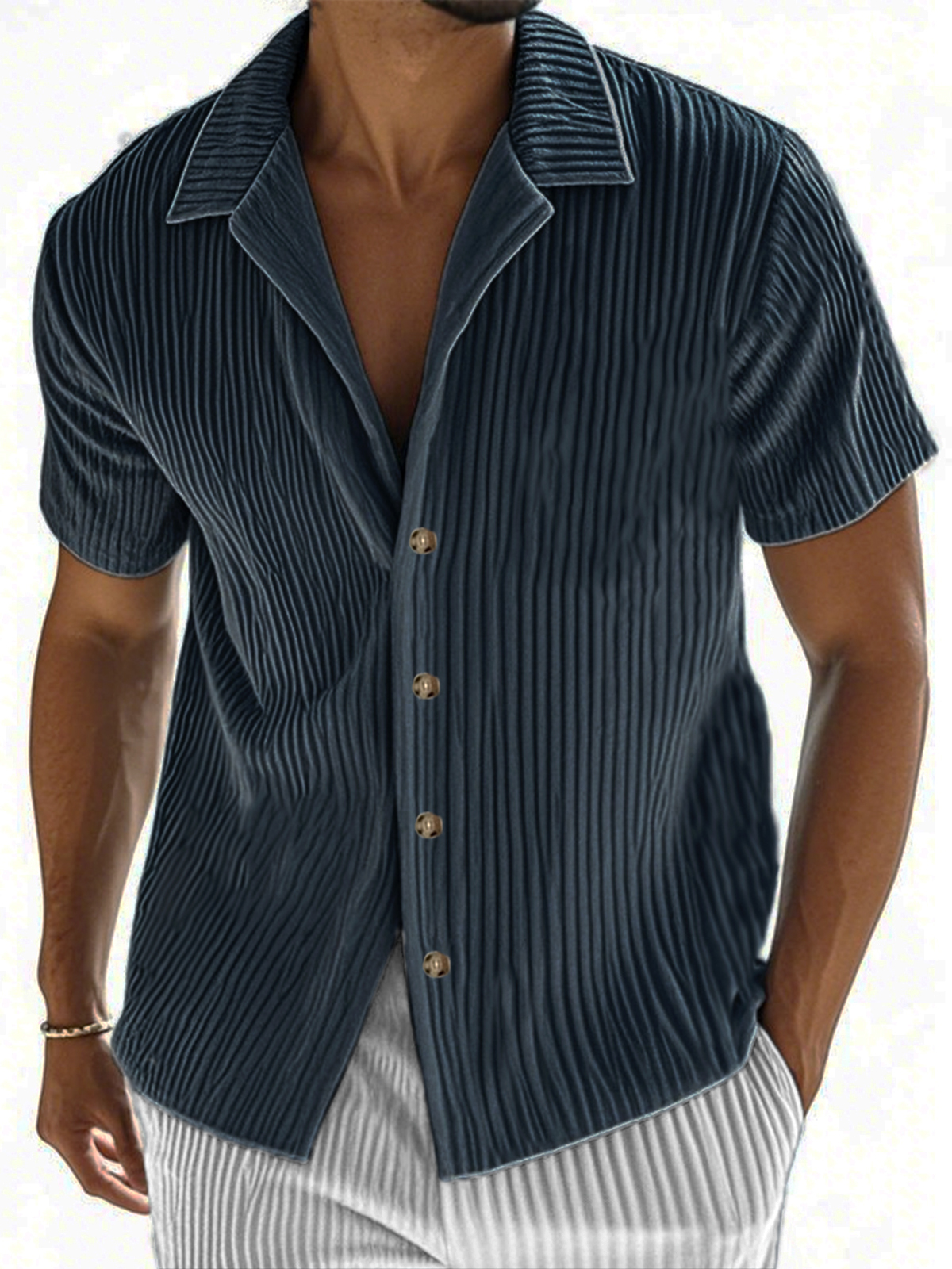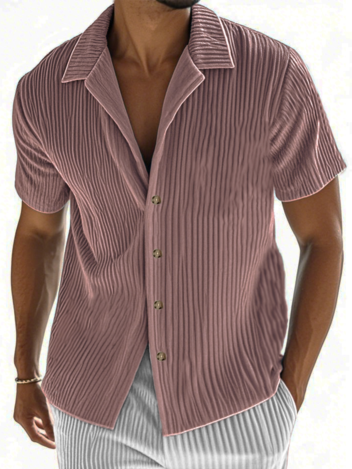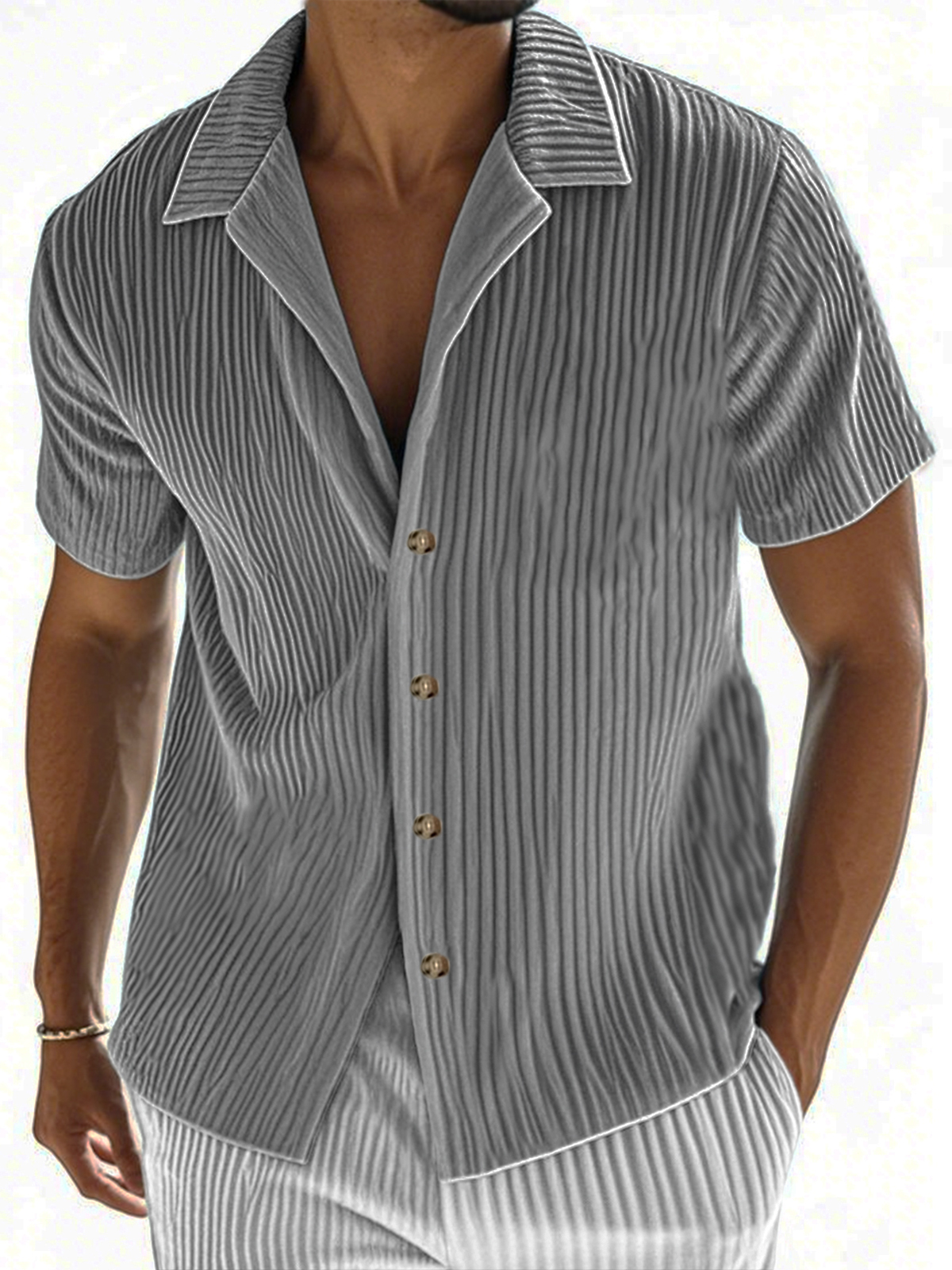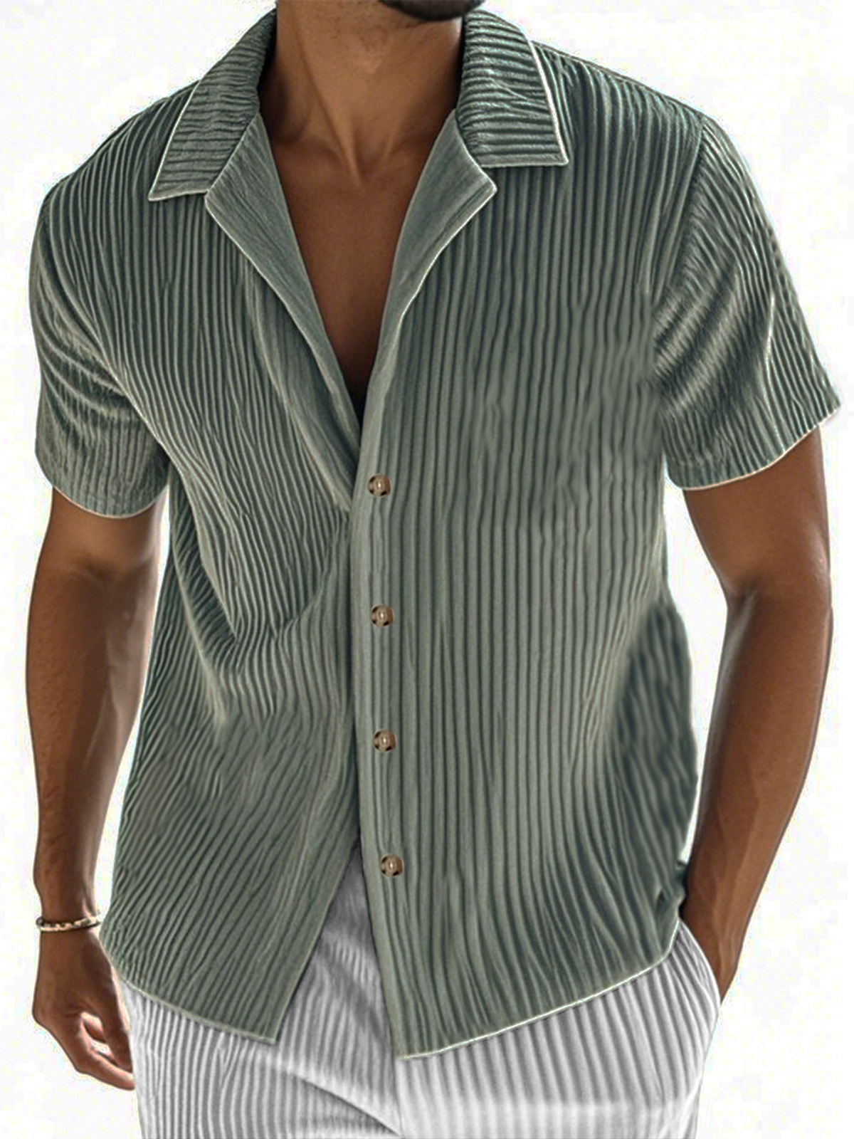 • Men's Ribbed Vertical Striped Camp Collar Short-sleeved Lapel Shirt