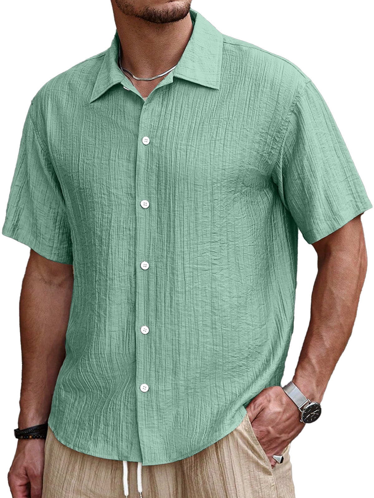 Men's Simple Casual Pleated Solid Color Short Sleeve Button Lapel Shirt