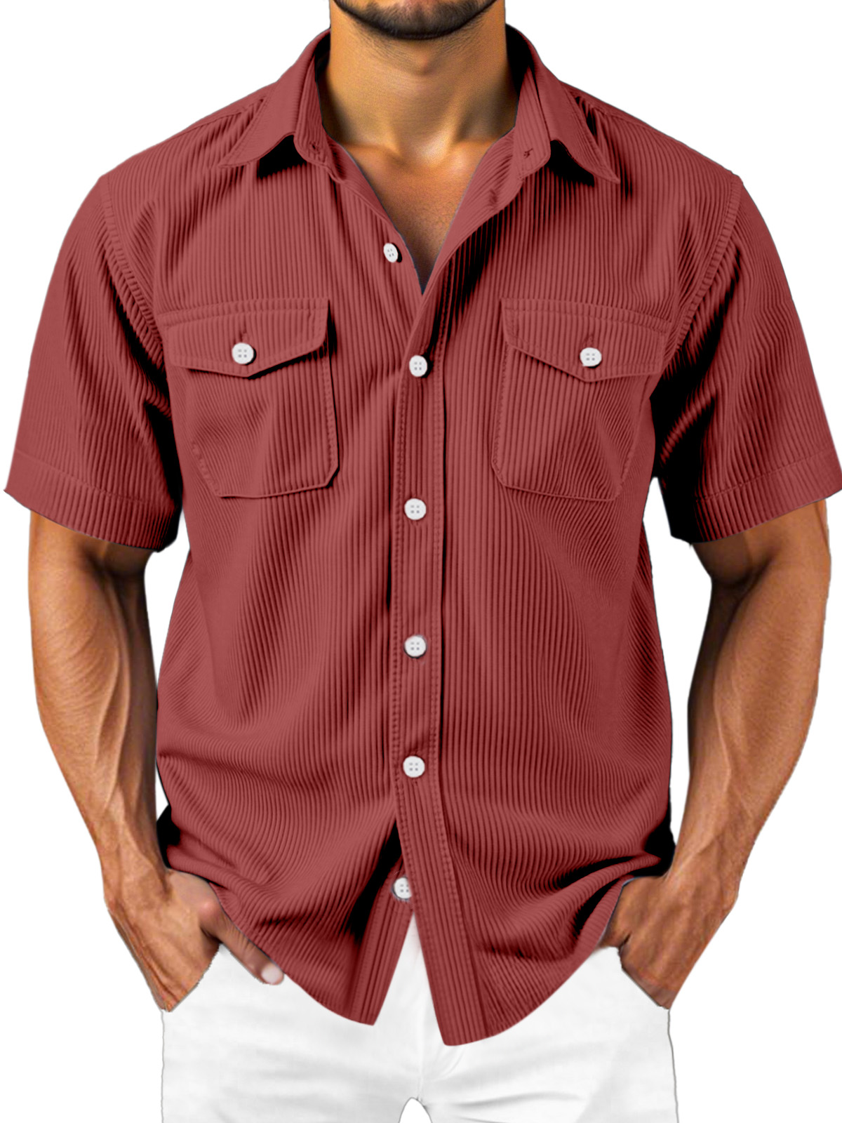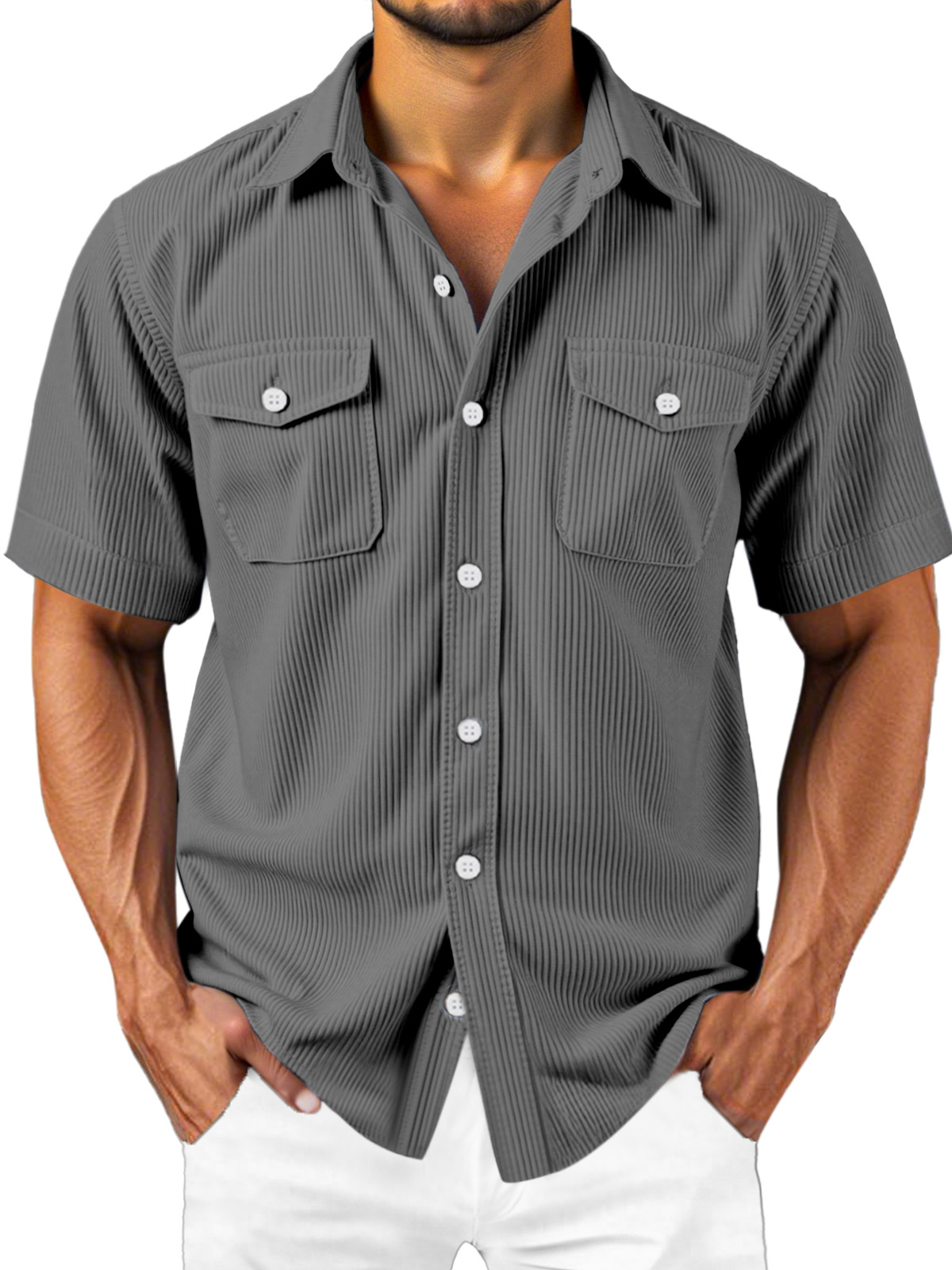 Men's Simple Vertical Pit Strip Solid Color Retro Double Pocket Short-sleeved Shirt