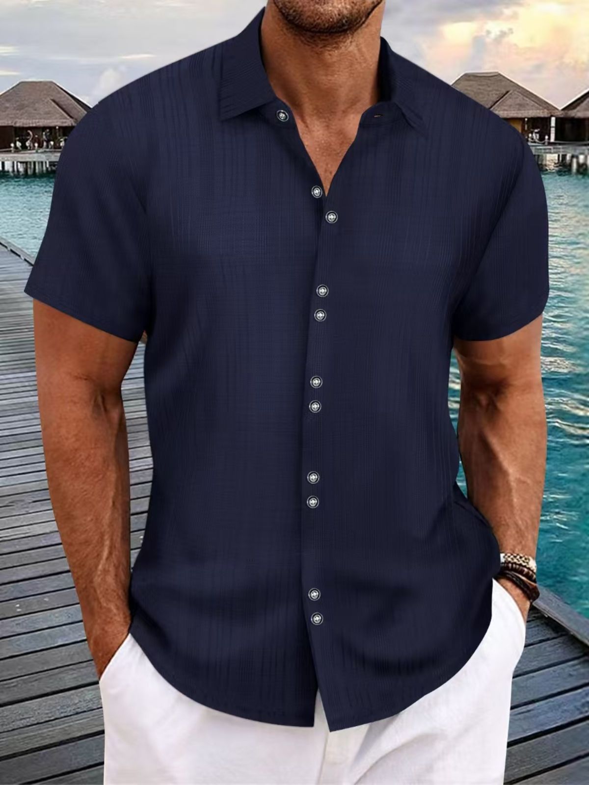 Men's Slubbed Linen Texture Beach Casual Multi-Button Loose Short Sleeve Shirt