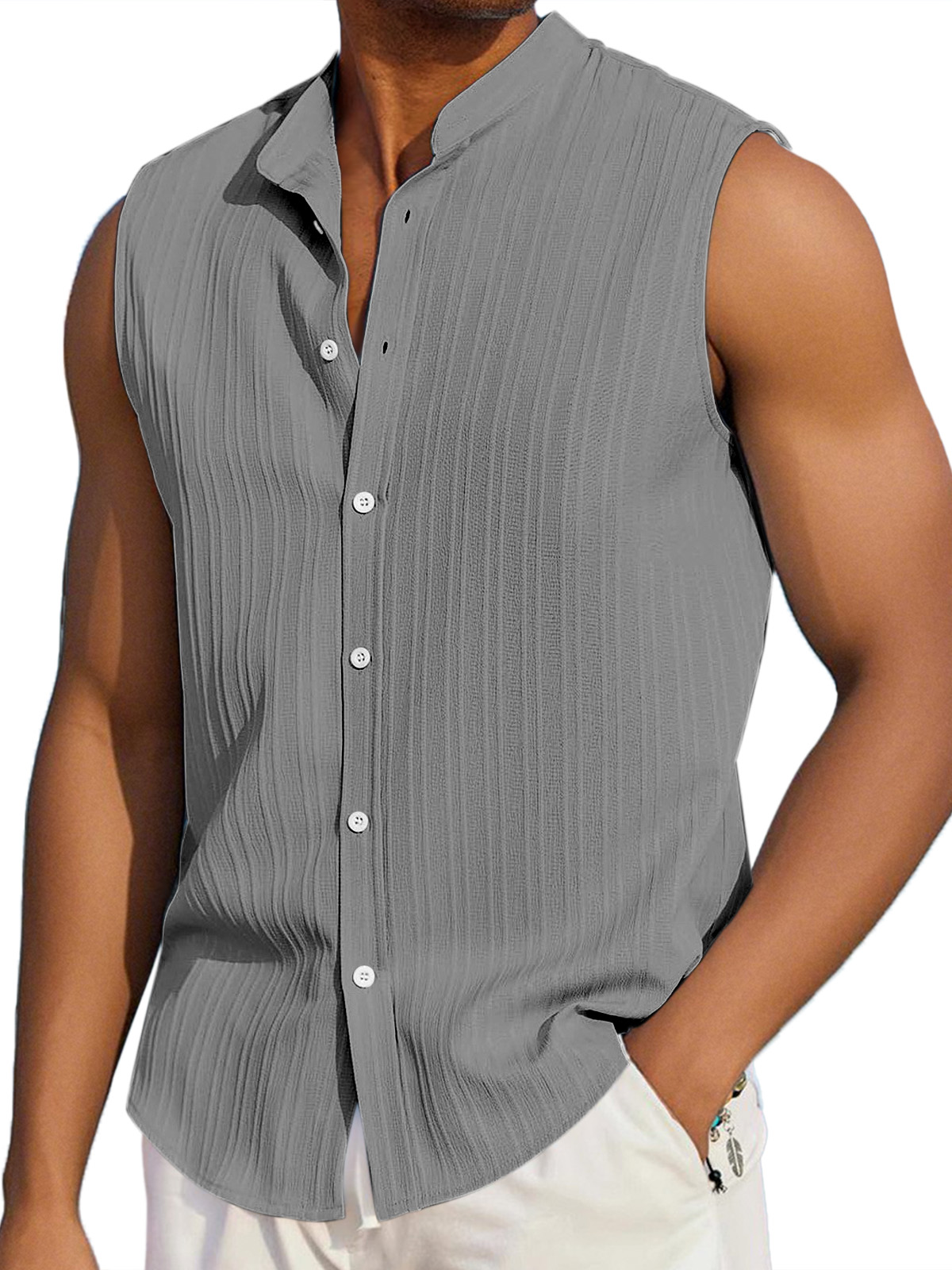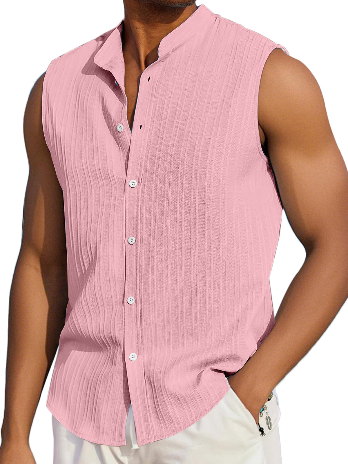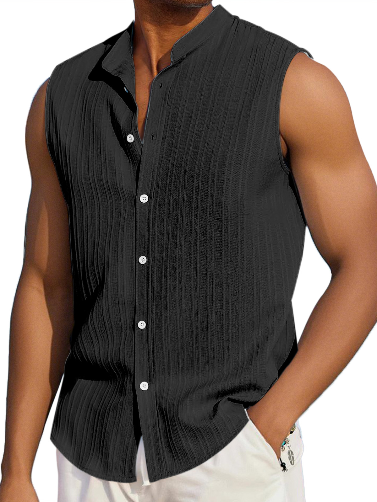 Men's Summer Casual Solid Color Vertical Stripe Loose Lapel Button Sleeveless Shirt