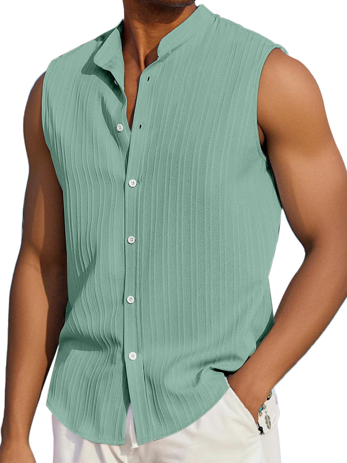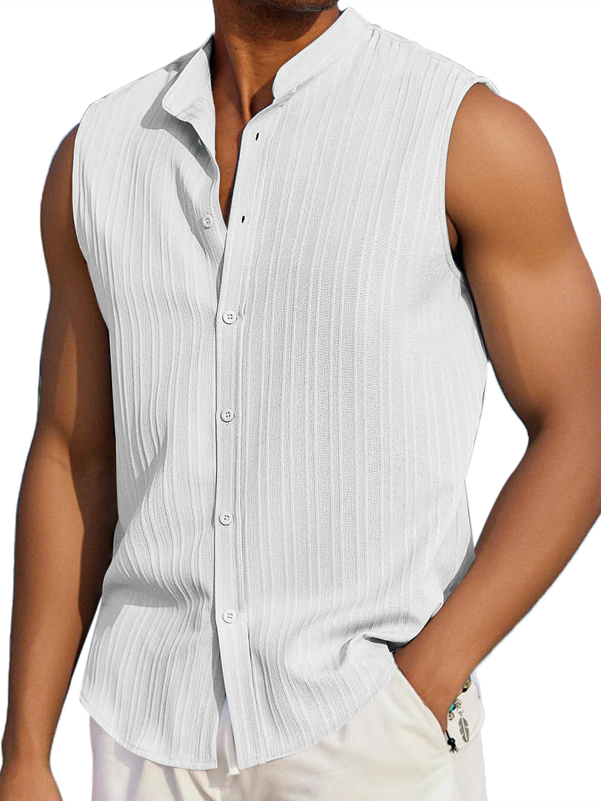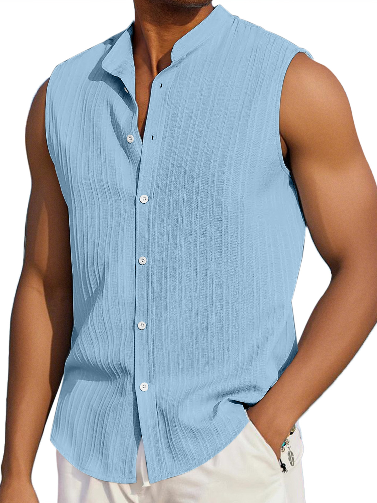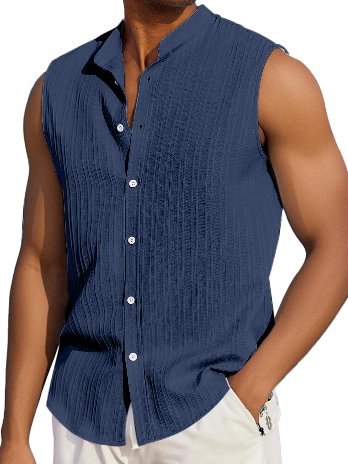 Men's Summer Casual Solid Color Vertical Stripe Loose Lapel Button Sleeveless Shirt