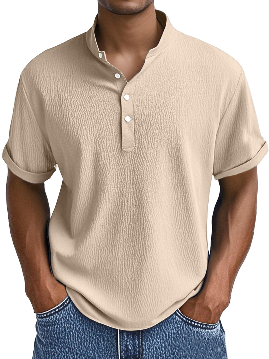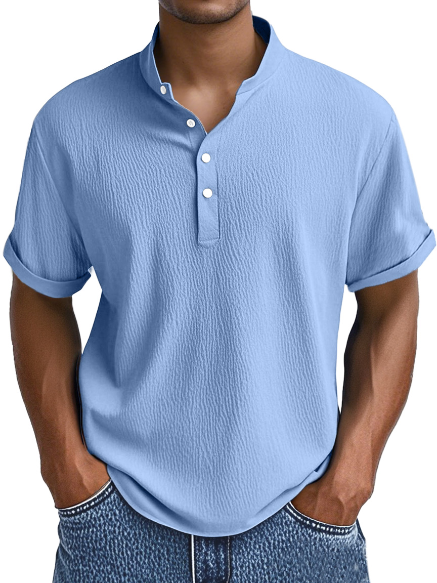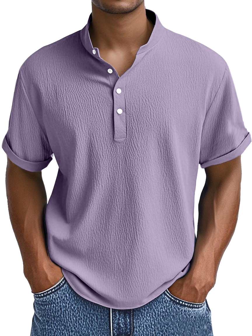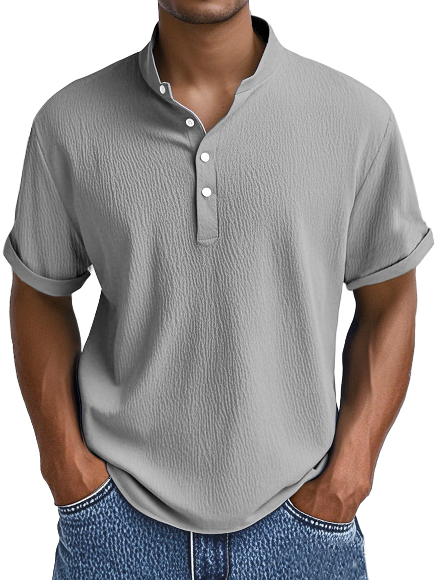 Men's Summer Daily Solid Color Pleated Texture Short-sleeved Henley Shirt