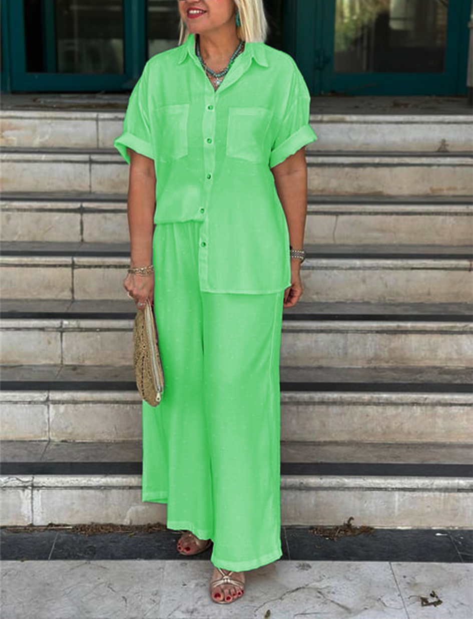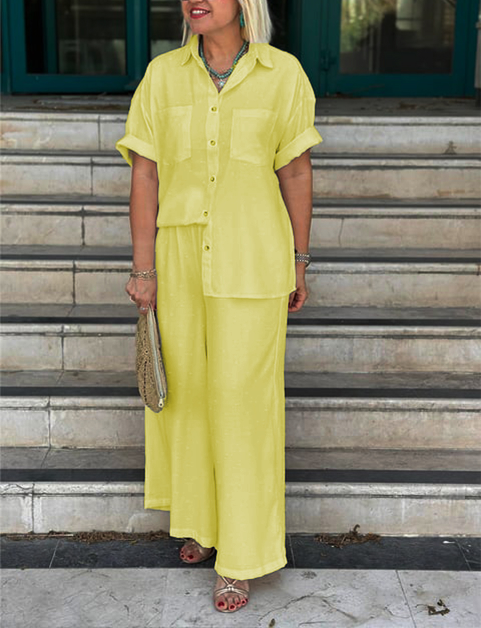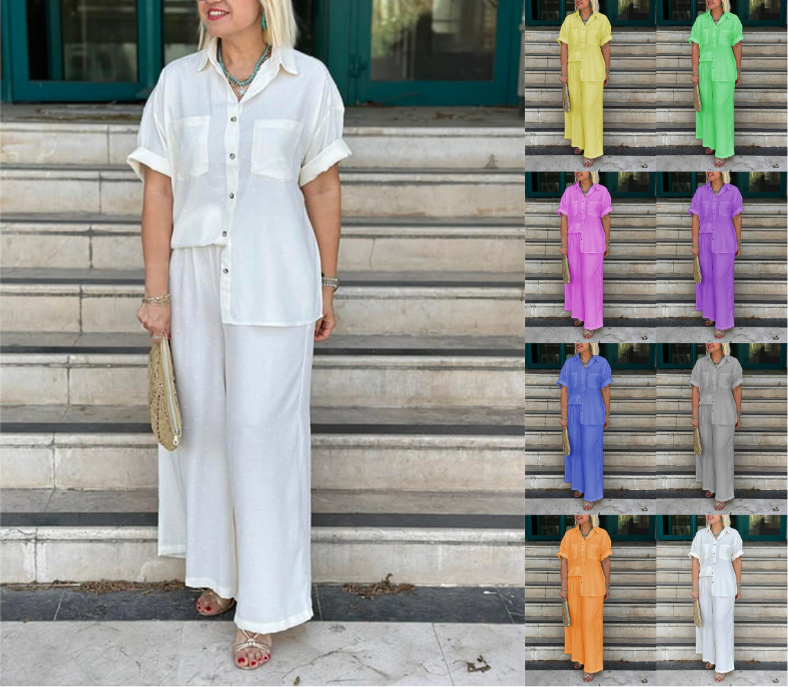 NEW🔥Women's Cream Embossed Pattern Shirt Wide Leg Suit