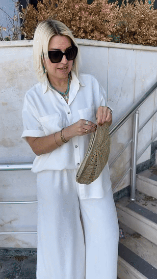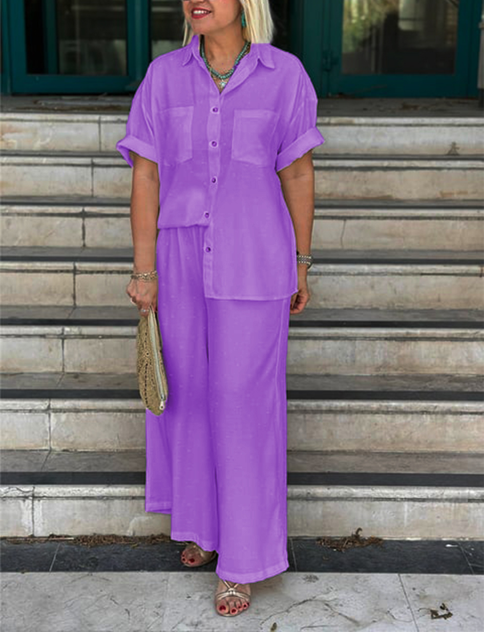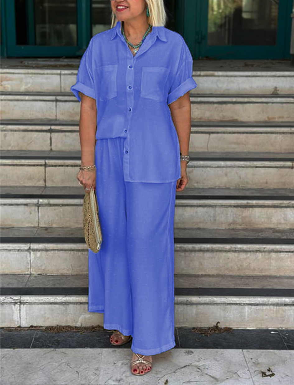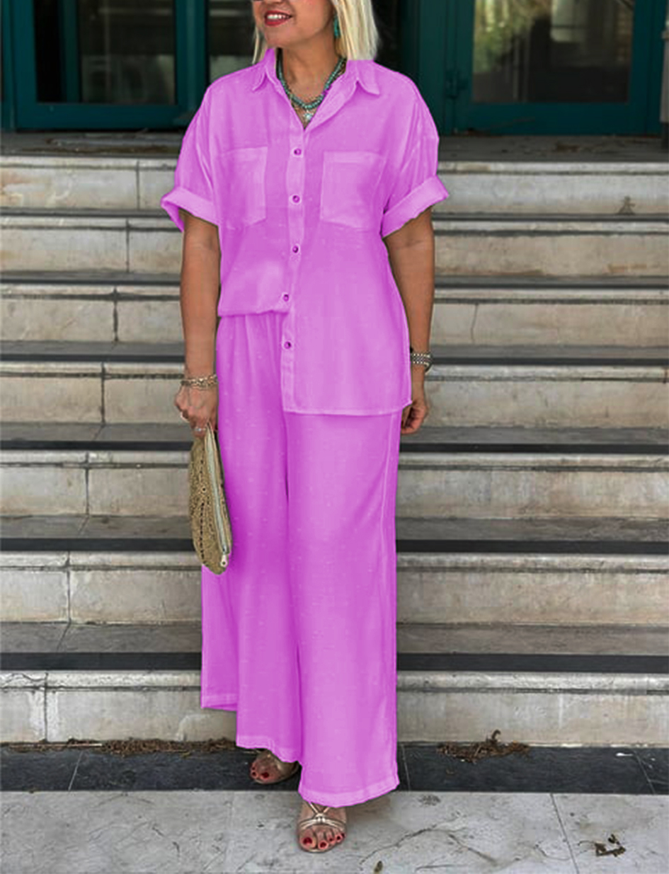 NEW🔥Women's Cream Embossed Pattern Shirt Wide Leg Suit